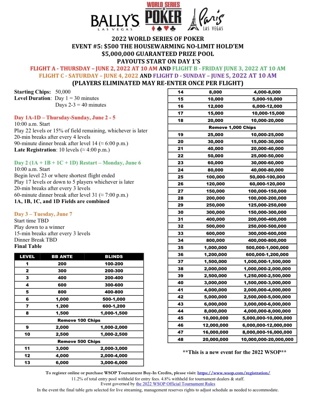 Wsop On Twitter The Final Day 1 Flight Of The 500 Housewarming Has The Same Structure Adjustments From Saturday That Differ From The Published Structure An Extended Color Up Break After Level 8